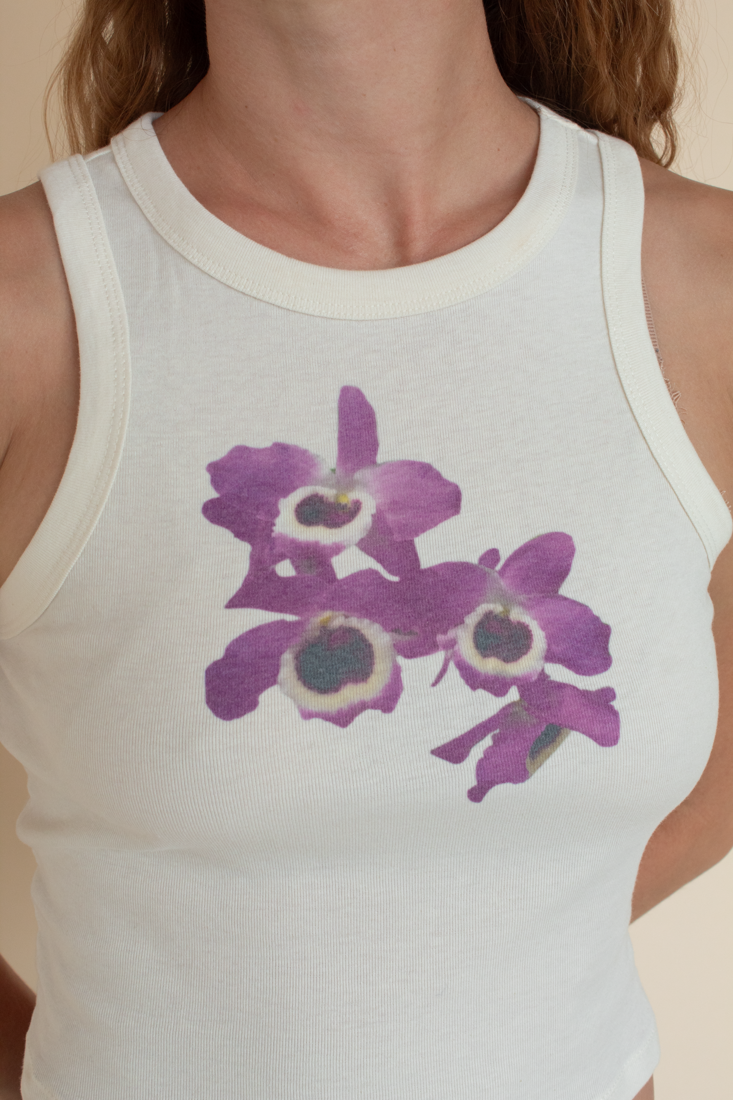 An ode to our time in Brazil. Orchid photos taken at the Rio Botanical Gardens & printed onto a soft fitted mid length racer tank 🌸 Â